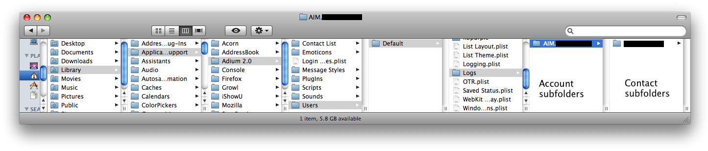 - The contents of that folder are subfolders, one per account; the contents of each subfolder are more subfolders, one per contact. So, for example, if your AIM username is jdoe and you have a contact named jsmith, the logs folder will contain a folder named “AIM.jdoe” that contains a subfolder named “jsmith”.